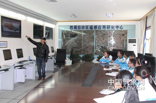 西藏自治区遥感应用研究中心拉巴给学生讲解卫星遥感监测积雪、森林火灾、干旱等知识