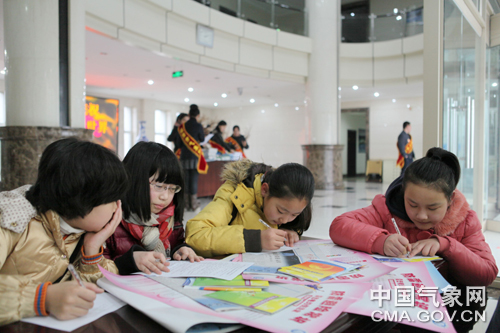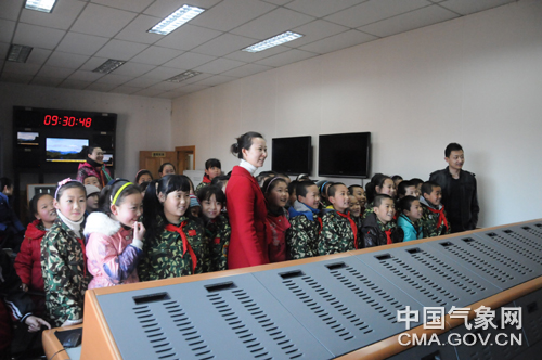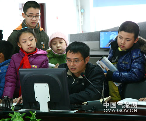 最后一站小记者们来到了天津市气象台会商室,在这里,他们见到了市气象台首席预报员赵刚。一听说是首席预报员,小记者们立刻拿起话筒,大有要开展深入采访的架势:“现在天津已经进入春天了吗?”、“今年天津为什么下雪这么少呢?”、“为什么南方雨雪不断呢?”面对一个个问题,赵刚一一为他们进行了解答。