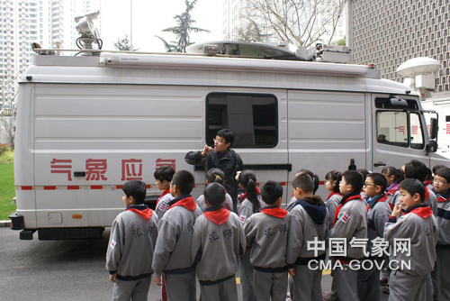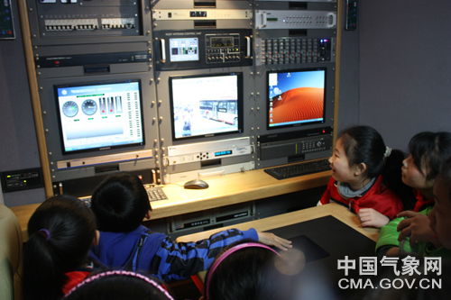 “应急车就像一个袖珍的观测场和移动的气象台,灾害天气发生时,可以开到现场采集气象信息,进行数据处理,还可以通过卫星系统进行连线,和你们刚刚参观的气象台进行视频会商。看,电视里就有你们了!”信息中心的气象专家在车里一遍一遍的向参观者介绍应急车,“大家下车后还可以看看车顶的天气雷达,像盘子一样……”通俗易懂的语言把原本枯燥的知识修饰得生动形象。