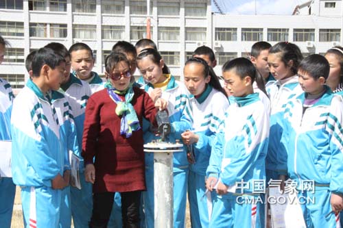 拉萨市地面观测工程师李文华正在给学生讲解日照观测知识