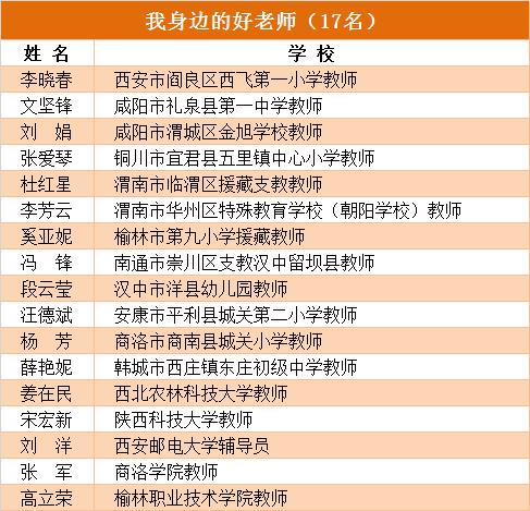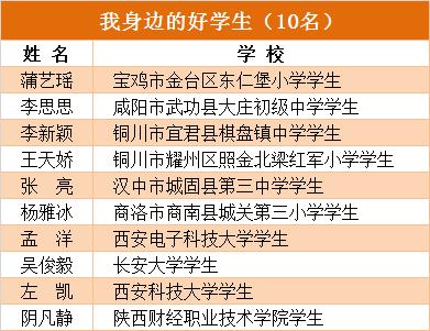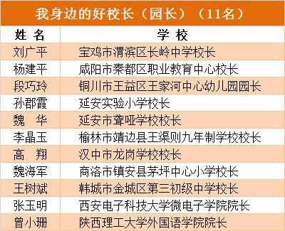 宝鸡市渭滨区长岭中学校长刘广平等11名校长(园长)被评为“我身边的好校长(园长)”,西安市阎良区西飞第一小学教师李晓春等17名教师被评为“我身边的好老师”,宝鸡市金台区东仁堡小学学生蒲艺瑶等10名学生被评为“我身边的好学生”。