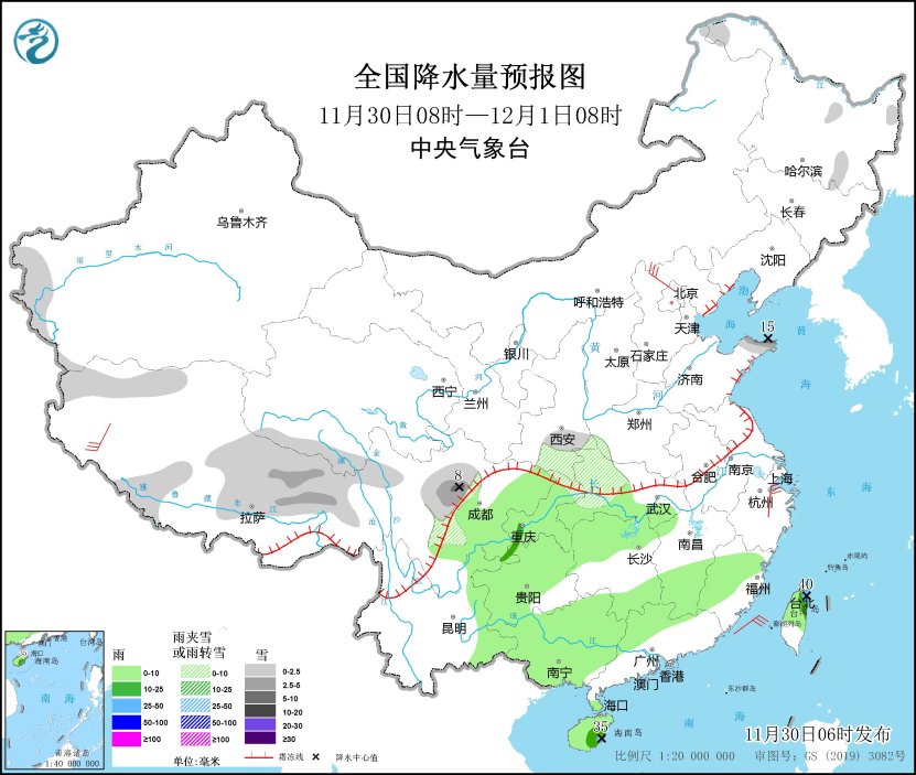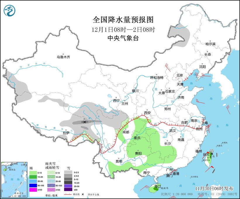 12月1日08时至2日08时,内蒙古东部、山东半岛北部、新疆南疆西部山区、西藏北部和东部、青海南部、川西高原北部等地部分地区有小雪或雨夹雪,其中,西藏东部等地部分地区有中到大雪(5~8毫米)。四川盆地东部、贵州、湖南南部和西部、云南东南部、广东北部、广西中北部、海南岛、台湾岛等地部分地区有小到中雨,其中,台湾岛东部局地有大雨(25~35毫米)。辽东半岛、华北北部、浙江东部等地部分地区有5~6级风(见图4)。