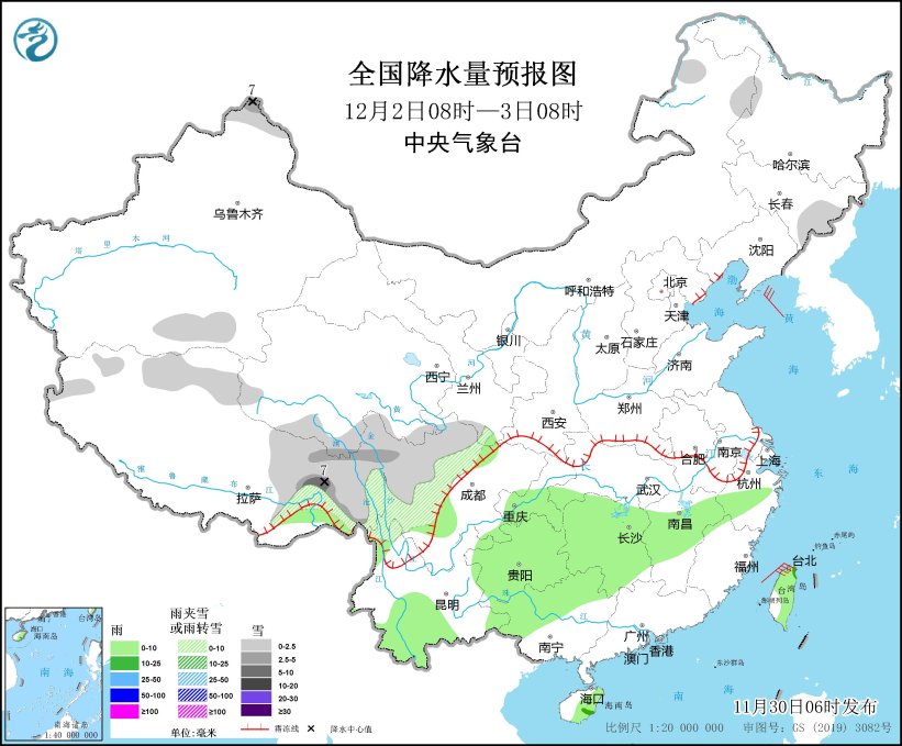 12月2日08时至3日08时,内蒙古东北部、吉林东部、新疆北疆北部和南疆盆地、西藏北部和东部、青海南部、川西高原等地部分地区有小雪或雨夹雪,其中,新疆北疆北部、西藏东部等地部分地区有中到大雪(5~7毫米)。湖南、重庆中南部、贵州、江西中部、广西北部、浙江中部、云南南部、海南岛东部、台湾岛等地部分地区有小雨,其中,海南岛东部、台湾岛北部局地有中雨(见图5)。