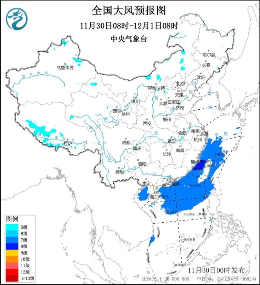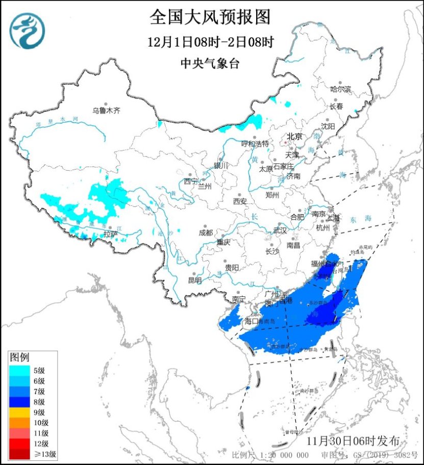 摘要:11月30日08时至12月1日08时,新疆北部、西藏南部、内蒙古中东部及我国东南沿海地区将有5~6级、阵风7~9级的大风;东海南部海域、台湾海峡、台湾以东洋面、巴士海峡、南海北部和中部海域、北部湾将有7~8级,阵风9级的大风。12月1日08时至12月2日08时,西藏中西部、青海西南部、内蒙古中部及我国东南沿海地区将有5~6级、阵风7~9级的大风;东海西南部海域、台湾海峡、台湾以东洋面、巴士海峡、南海北部和中部海域、北部湾将有7~8级、阵风9级的大风。中央气象台11月30日06时继续发布大风蓝色预警(见图1、图2)。