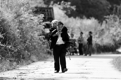 天气好的时候张安兵就背着母亲串门 本报记者 陈飞波 摄