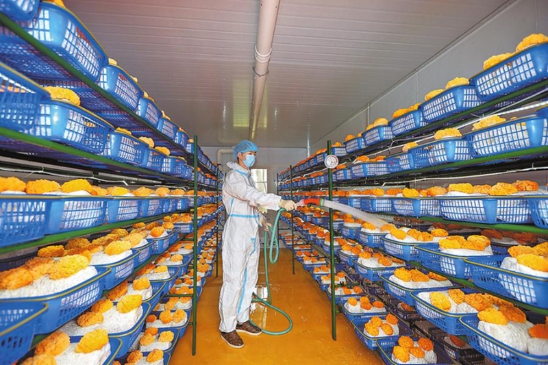 工作人员在金耳种植方舱内为金耳浇水。记者 党骁 摄