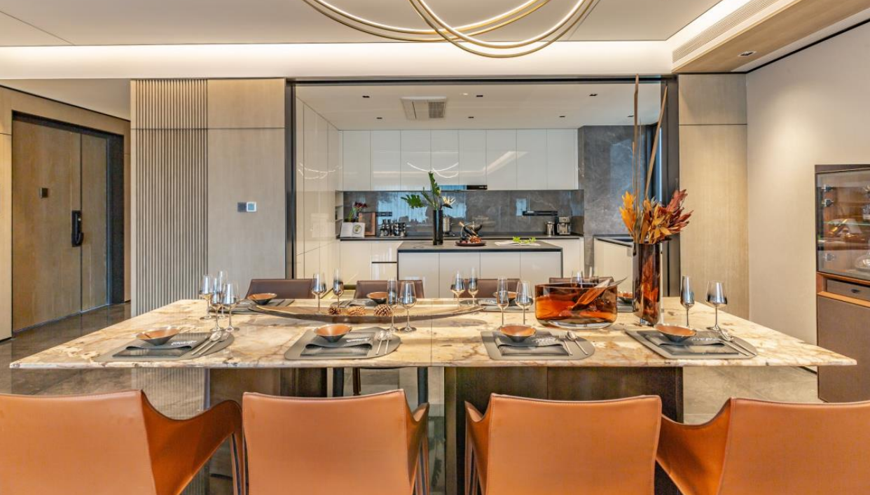 餐厅巧借布局演绎用餐空间美学,删繁就简,拓宽建筑尺度,让阳光、风景做生活的主角;整体色调纯白,映衬万物,自在悠闲;270°观景落地窗,可以毫无遮掩地看到外面的美景,光影、绿植、清水与好闻的烟火气结合,居者纵享烹饪乐趣,觥筹交错间品味自在惬意,享受舒适、安静、健康的家居生活。