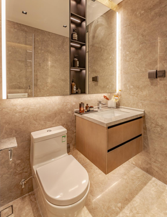 卫生间依旧坚持简约的造型,雅致的配色,加上开放格让收纳无处遁形,温柔色调浸润区域,以轻盈姿态承载收纳功能,紧密人与场景的微妙关系。