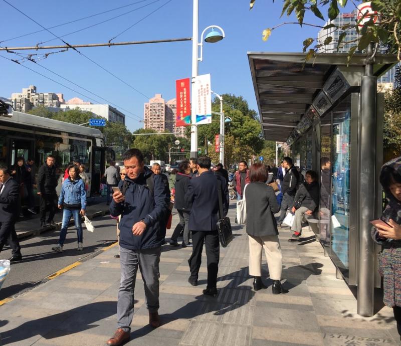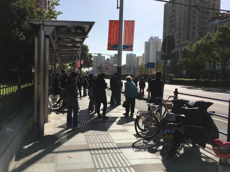 早晨8点不到,上海市大连路东侧的大连路/长阳路公交车站,已经挤满了在此等候公交车的市民。