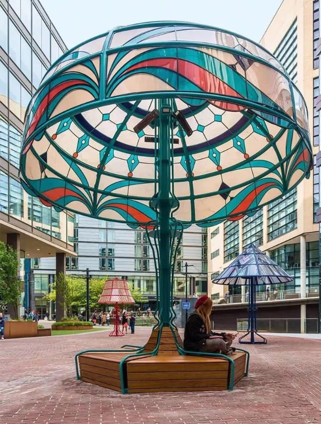 在英国的曼彻斯特市,设计师把“家具”引入了公共场合,他们在城市广场放置了5个巨大的、有趣的台灯,兼具凉亭和座椅、路灯功能。每个台灯都反映了曼彻斯特一个独特的历史阶段,包括Art Deco风格(装饰派艺术)、Art Nouveau(新艺术主义)、Victorian(维多利亚时期)、中世纪风格和当代风格时期。以城市家具描述了一幅抽象的城市历史地图,成为彰显城市历史文化的独特方式。