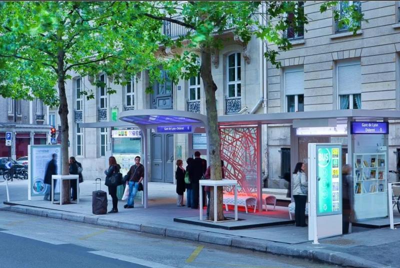 作为巴黎公交车站和地铁站改造计划的一部分,Osmose Bus Stop超越了原有功能,为当地居民提供智慧服务。位于巴黎狄德罗大道(Boulevard Diderot)的Osmose Bus Stop是巴黎“未来巴士站”中的一个,它位于昼夜公交线路的十字路口,每天约有15000名乘客。它不仅仅是一个专用于公共汽车的等候区,更是一个智慧化的生活空间:交互式触摸屏可以浏览地图、查看巴士实时信息、购买活动门票、查找当地企业和服务等,服务区还提供借阅图书、电动自行车自助充电、手机充电、无线WiFi等休闲功能。