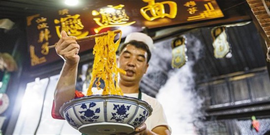 在礼泉县袁家村,一碗热腾腾的biáng biáng面吸引着游客的味蕾。 本版照片均由本报记者 赵晨摄