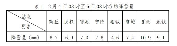 2月4日08时至5日08时,我市出现大雪,局地暴雪,降雪量4.6mm(柘城)~10.9mm(夏邑)(见表1)。