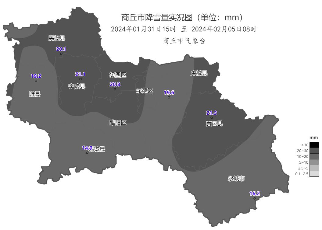图1 2024年1月31日15时至2月5日08时商丘市总降雪量实况图