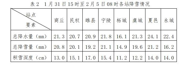 1月31日15时至2月5日08时,我市出现持续雨雪天气,累计降水量16.1mm(柘城)~24.1mm(夏邑),累计降雪量14.9mm(柘城)~21.2mm(夏邑),积雪深度11.2cm(柘城)~17.0cm(睢县)(见表2)。