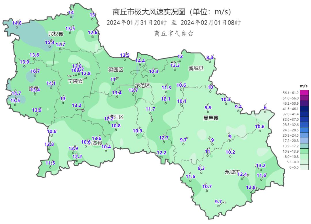图2 2024年1月31日20时至2月1日08时商丘市大风实况图