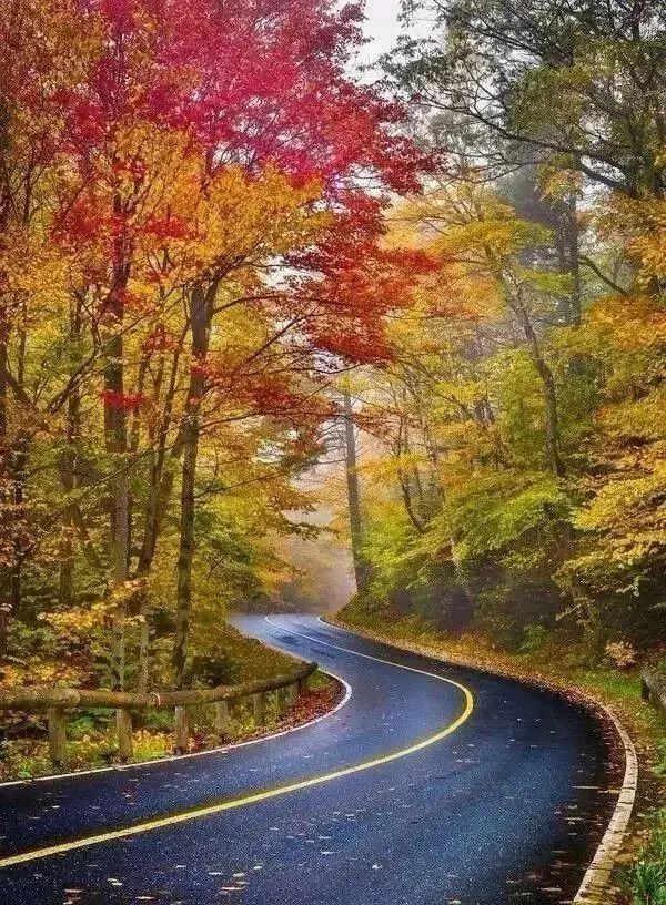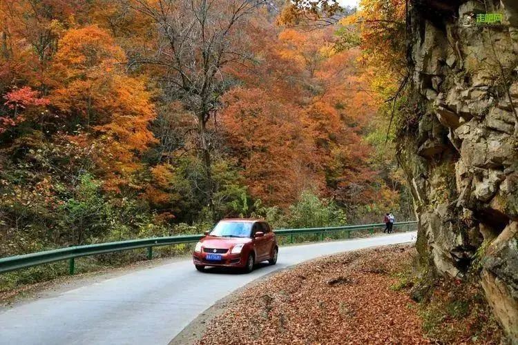这里景美人少,秋季来自驾这条路,落叶醉倒在风中,游人醉在落叶中。
