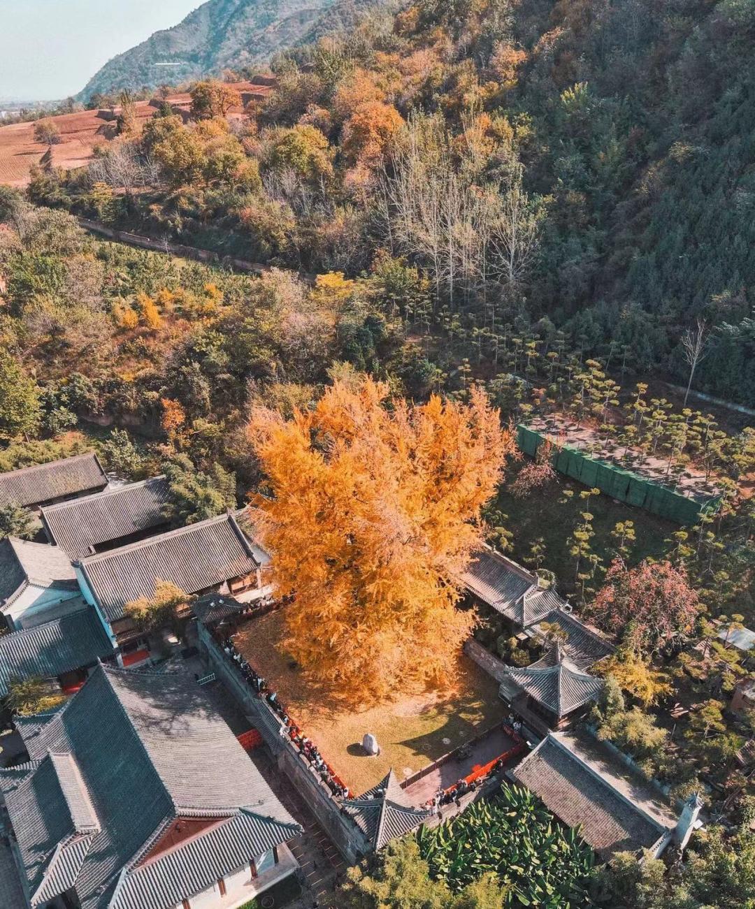 从沣峪口下108省道,大概10分钟左右的车程,就是古观音禅寺,深秋时节,那株千年古银杏一片金黄,美不胜收。