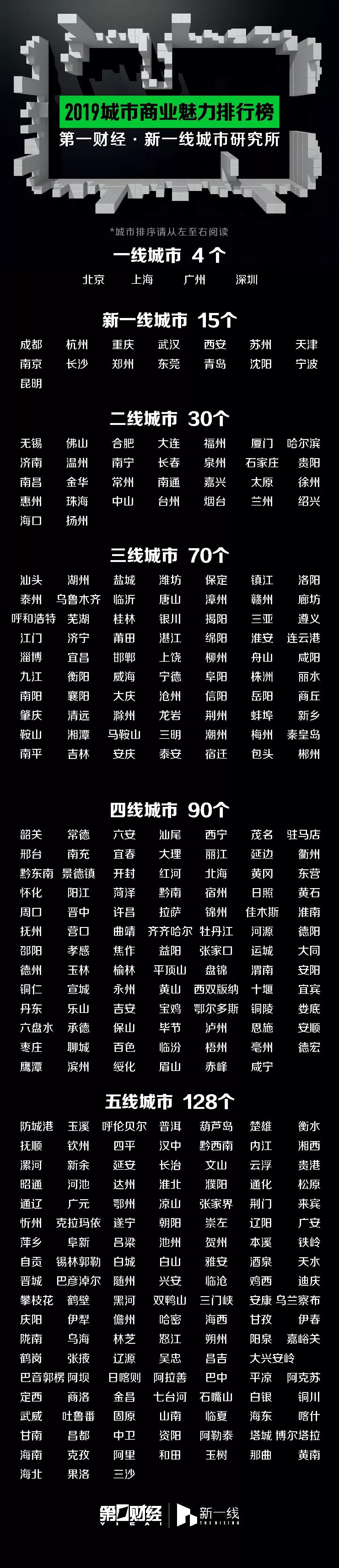 2019年,15座新一线城市依次为成都、杭州、重庆、武汉、西安、苏州、天津、南京、长沙、郑州、东莞、青岛、沈阳、宁波、昆明。头部4座新一线城市的位次相对稳定,无锡则继2017年之后再一次跌出这一梯队。