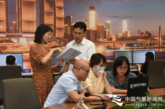 暴雨来临之前重庆市气象台工作人员讨论现场。李俊摄影