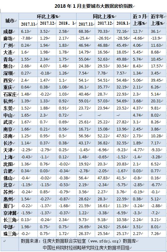 人民网北京3月2日电 (王子侯)日前,中国社科院财经战略研究院、中国社科院城市与竞争力研究中心发布了2018年2月《中国住房市场发展月度分析报告》。报告显示,2018年1月北京、上海等城市房价持续稳中有降,热点二线城市房价总体趋于平稳,环京超跌板块出现止跌回涨。