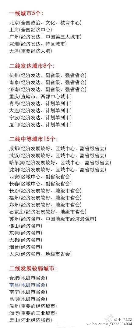 据该统计,全国一线城市有5个,分别是北京、上海、广州、深圳以及天津。二线发达城市有8个,分别是杭州、南京、济南、重庆、青岛、大连、宁波、厦门。二线中等城市有成都、武汉、哈尔滨等15个。