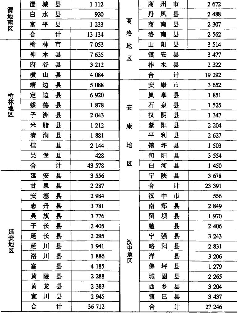 (四)延安专区(专员公署驻延安县),辖延安、延长、安塞、志丹、吴旗、鄜县、甘泉、宜川、黄陵、洛川、黄龙、宜君12县。