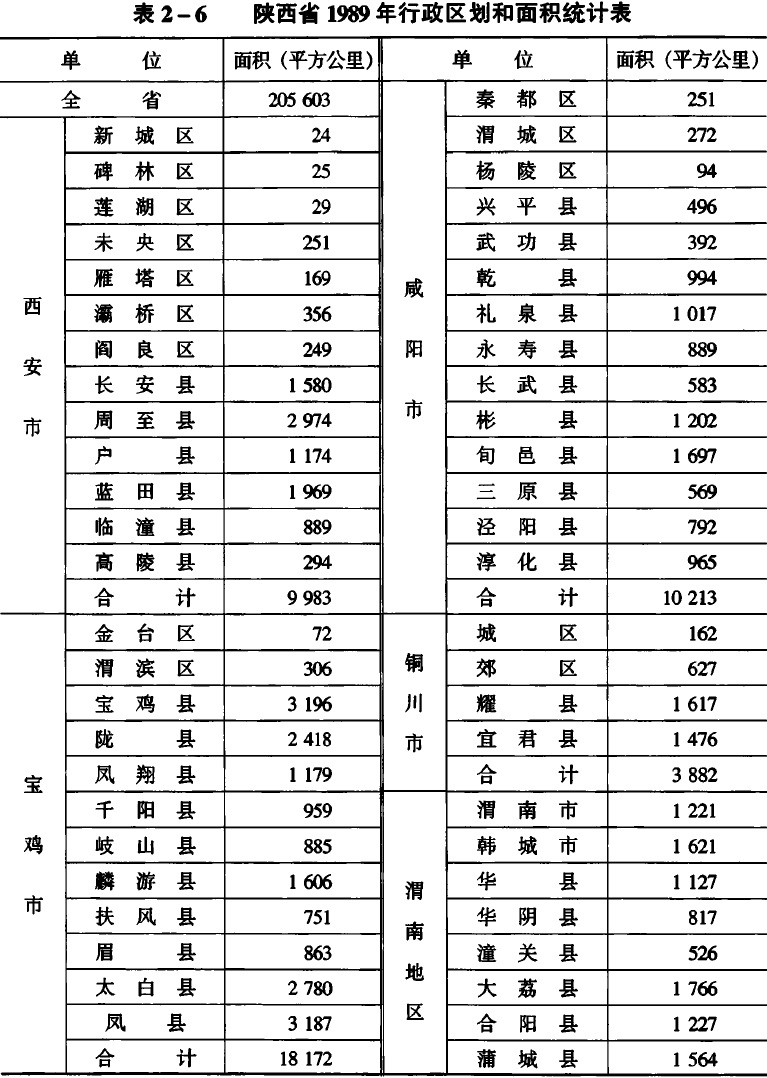 1983年9月9日经国务院批准撤销咸阳地区,原辖兴平等10县划归咸阳市(地级市),周至、户县、高陵及原属渭南地区的临潼、蓝田5县划归西安市,将宝鸡市的杨陵区和武功县划归咸阳市。截至1989年底,全省设有6个地区,4个省辖市,7个县级市,14个市辖区,86个县。具体划分是: