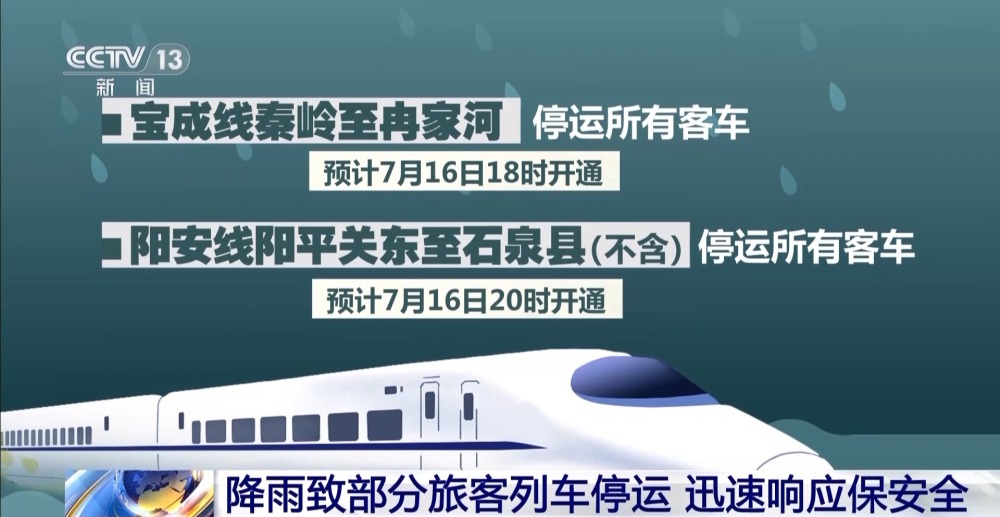 此外,陕西境内因本轮降雨预计累计停运宝成、阳安、襄渝线客车70列、缩短区段18列。宝成线秦岭至冉家河停运所有客车,预计今天(16日)18时开通;阳安线阳平关东至石泉县(不含)停运所有客车,预计今日20时开通。