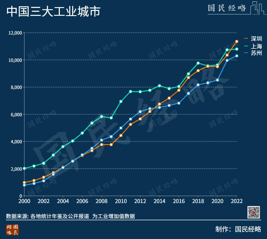 作为我国工业体量最大的三个城市,上海、深圳、苏州一直是你追我赶,上海长期作为领跑者,深圳苏州各有所长。