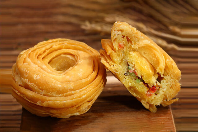 寿县大救驾是安徽六安十大名吃之一。据maig oo网小编了解,寿县大救驾是一种油性面饼,有在危急之中救了皇帝和君王的典故,因而被命名为“大救驾”,距今已有一千多年的历史。寿县大救驾以白面、白糖、香油、青红丝、核桃仁等材料制作而成,其外皮有数道花酥层层叠起,金丝条条分明,中间如急流旋涡状,外皮酥脆,馅细软,色泽金黄,香味扑鼻,细细品尝有果香味,深受五湖四海食客的欢迎。来到六安,不要忘记尝尝寿县大救驾哦! 【 详细>>】