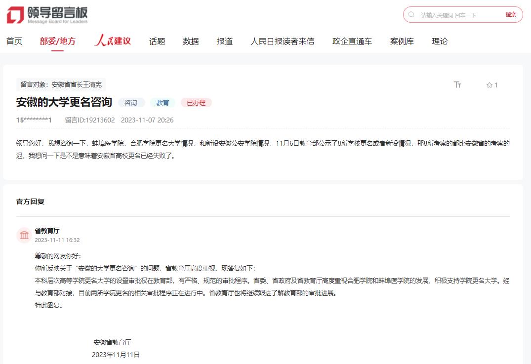 近日,有网友在人民网领导留言板咨询蚌埠医学院,合肥学院更名大学情况,安徽省教育厅回复称,目前两所学院更名的相关审批程序正在进行中。