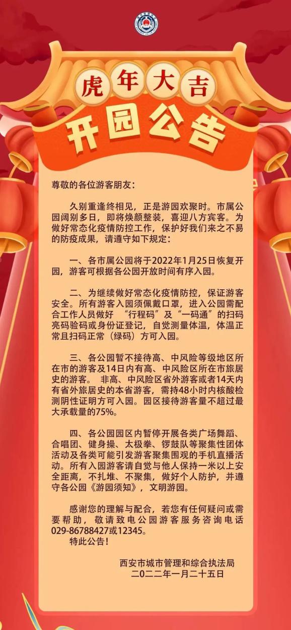 1月25日,西安市城市管理和综合执法局发布公告:根据统一安排,自1月25日起,包括莲湖公园、长乐公园、革命公园、丰庆公园、开元公园等在内的市属公园重新开园迎接市民。