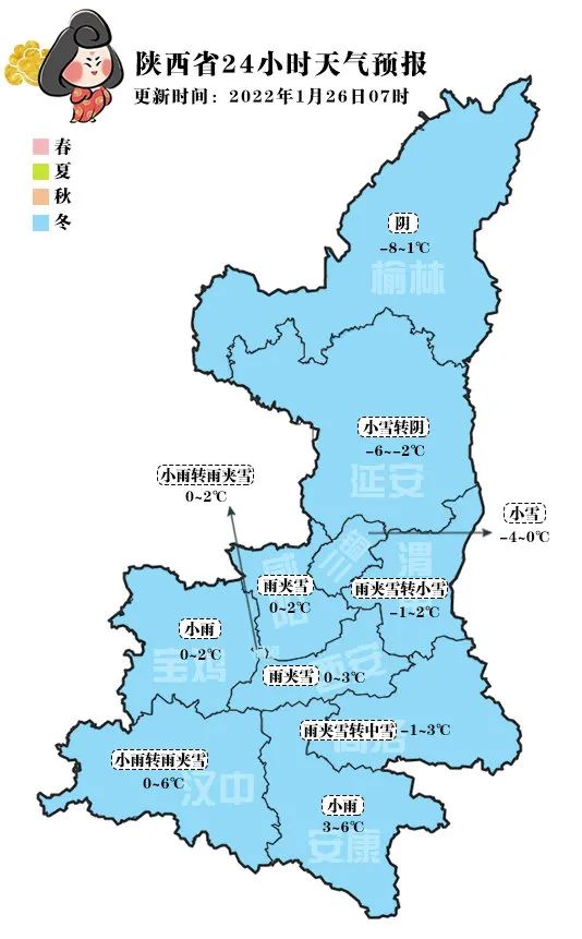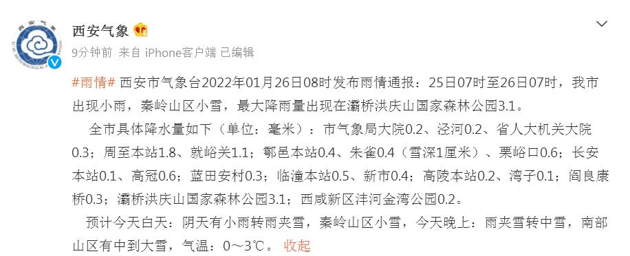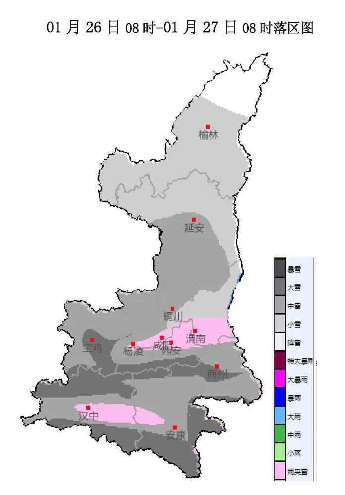 今天晚上全省阴天,陕北南部有小到中雪,关中、陕南有中到大雪或雨夹雪,其中西安西部、秦巴山区、陕南南部的局地有暴雪。