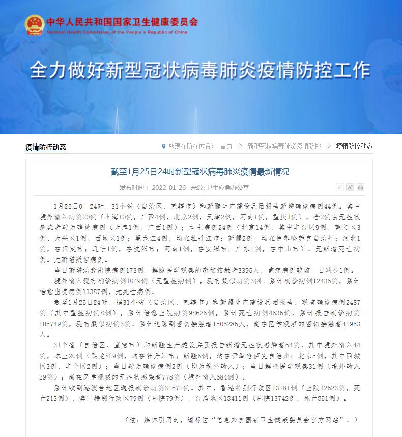 1月25日0—24时,31个省(自治区、直辖市)和新疆生产建设兵团报告新增确诊病例44例。其中境外输入病例20例(上海10例,广西4例,北京2例,天津2例,河南1例,重庆1例),含2例由无症状感染者转为确诊病例(天津1例,广西1例);本土病例24例(北京14例,其中丰台区9例、朝阳区3例、大兴区1例、西城区1例;黑龙江4例,均在牡丹江市;新疆2例,均在伊犁哈萨克自治州;河北1例,在保定市;辽宁1例,在沈阳市;河南1例,在安阳市;广东1例,在中山市)。无新增死亡病例。无新增疑似病例。