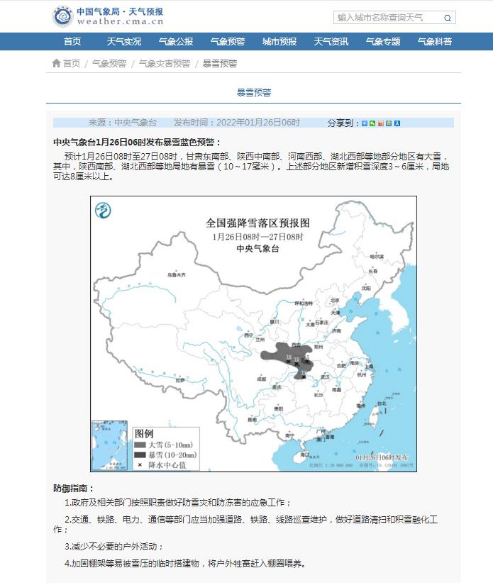 中央气象台1月26日06时发布暴雪蓝色预警: