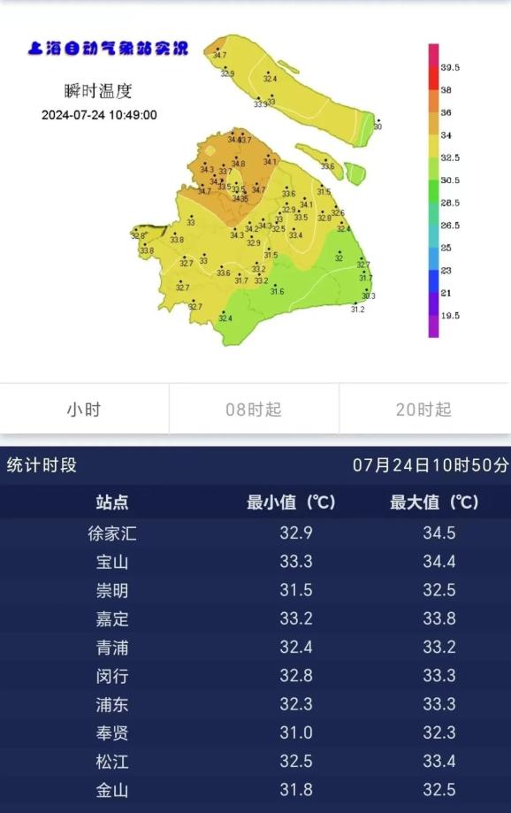 上海中心气象台2024年07月24日10时50分发布高温黄色预警信号:受副热带高压影响,预计嘉定、宝山、青浦、闵行和中心城区今天的最高气温将超过35℃,请注意用火用电安全,做好防暑防晒工作。