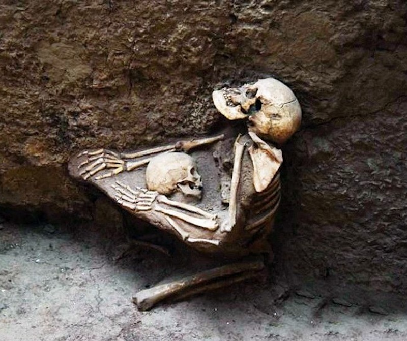 更为著名的例子是位于青海民和县的喇家遗址。该遗址最广为人知的特征有二:一是出土了距今约四千年、由小米和黍子制成的面条状食物;二是数组相拥而亡的人骨,这些人骨均发现于建筑遗址中,或蜷缩于墙角、或正向门外奔逃,呈现出成年人以身体护持儿童的状态,尤其是F3房址中发现的一具怀抱儿童女性人骨的影像最常被引用。令人动容的是,根据线粒体DNA分析结果,此二人很可能并非母系血亲,也就是说,他们至少不是母子关系。无论是出于姑侄、堂姐弟等父系血亲的亲情,还是同一氏族朝夕相处的感情,抑或单纯的人类爱护童稚的本能,成人在灾难发生的时刻奋不顾身地保护幼童,但终未改变罹难的结局。考虑到这些房址均有不同程度变形、坍塌,结合人骨的异常姿势和骨折等情况,喇家遗址反映的显然是一次地震的灾难现场,遗址中的砂土液化、地面开裂、地层错位等现象也可作为佐证。地震不仅是屋内居民遭埋压遇难,震后发生的严重洪水迫使幸存者也不得不放弃曾经的家园。