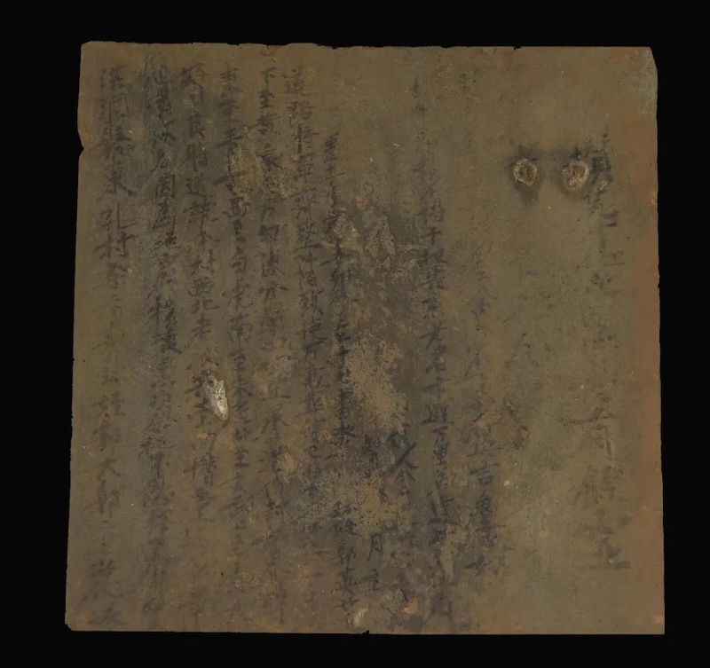 地震不仅夺去了许多生者的性命,还搅扰了已逝者的宁静。2021年,山西省文物考古研究院等单位在洪洞县甘亭镇西孔村发掘了一批元墓,其中一座编号M33的墓葬出土了一件墨书买地券。买地券是一种广泛流行于古代墓葬中的“土地凭证”,宋元时期更是极为普遍。买地券借用了现实中土地买卖契约的形式,象征着死者买下了墓地作为阴间居所,但内容多为虚指,例如花费“九千九百九十九贯钱”购买了“上至青天”“下至黄泉”四方至四神范围内的土地。它还常与道教符箓相结合,有避邪、厌胜之意。