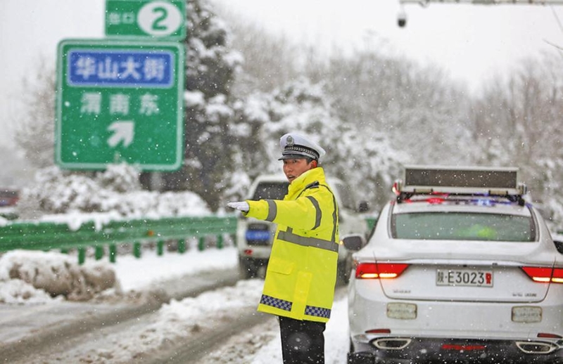 1月15日,连霍高速渭南东收费站出口方向,民警冒雪疏导交通,提醒车辆减速慢行。 记者 崔正博 摄影报道
