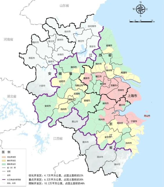 从地图可以看出,长三角城市群,覆盖了四省市的淮河以南大部分城市。