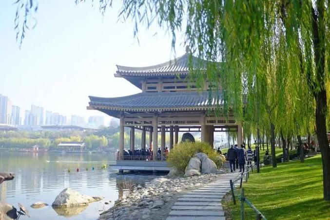 曲江池遗址公园里拥有很多大片空地环境,可以非常自由自在的放风筝,每年都有很多风筝爱好者聚集在这里。
