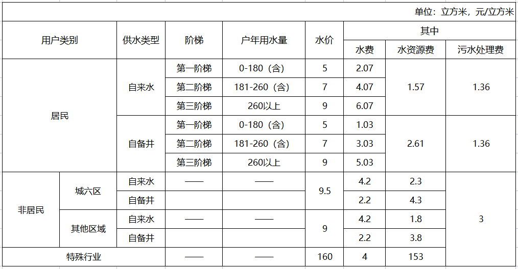 1、执行居民水价的非居民用户,水价统一按每立方米6元执行,其中:自来水供水的水费标准为每立方米3.07元,自备井供水的水费标准为每立方米2.03元;水资源费和污水处理费按阶梯水价相应标准执行。