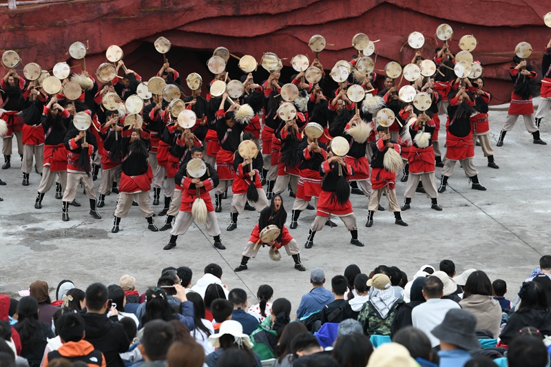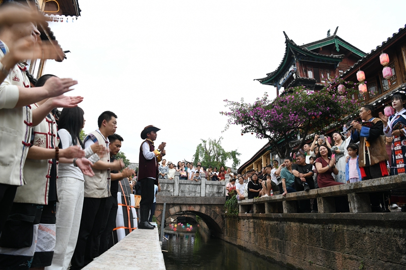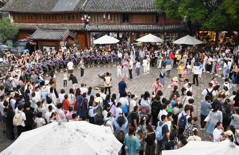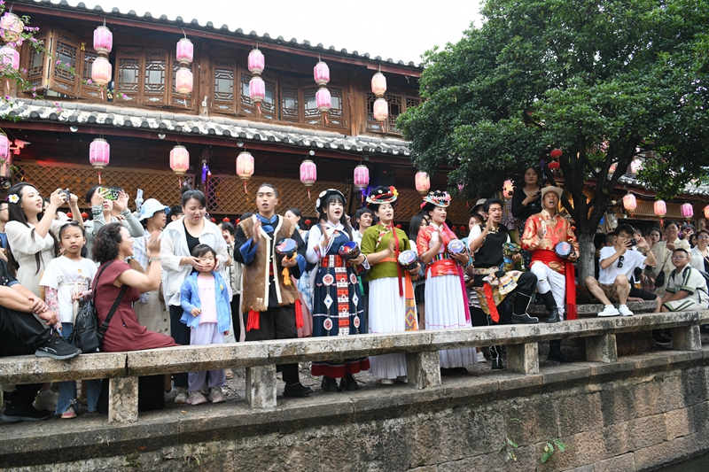 7月27日,云南丽江古城的对歌表演吸引了大量游客驻足观看。