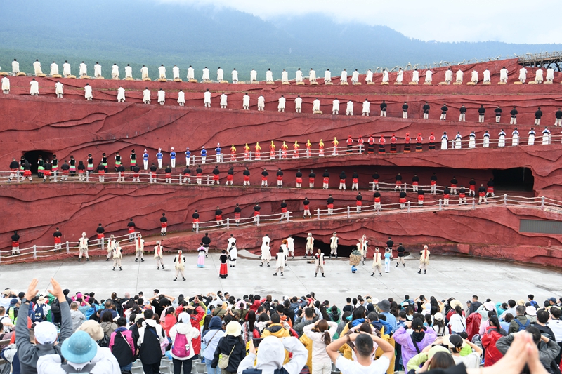 7月28日,游人在云南丽江玉龙雪山景区观看《印象丽江》演出。