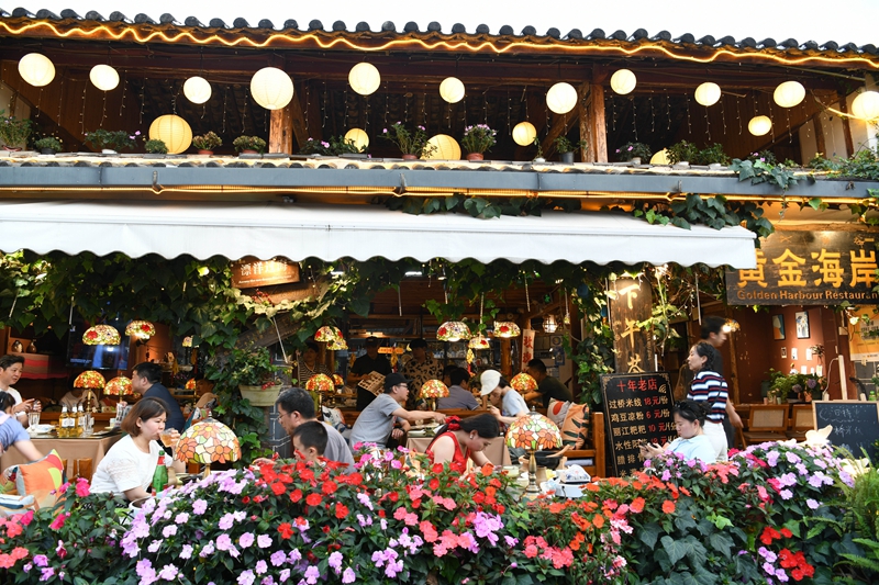 7月27日,游客和居民在云南丽江古城打跳游玩。