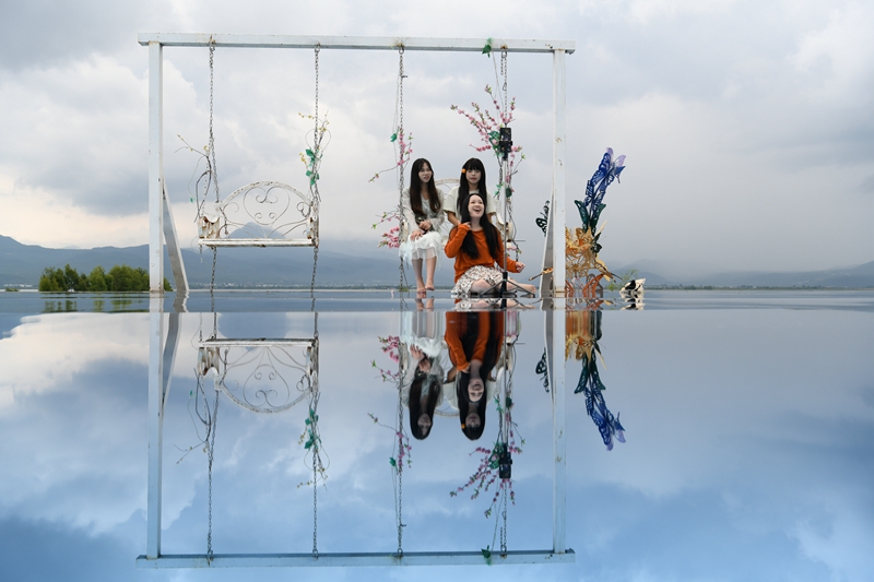 7月28日,游人在云南省丽江市玉龙纳西族自治县拉市镇均良村花花色玫瑰庄园游玩。