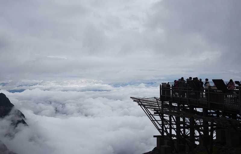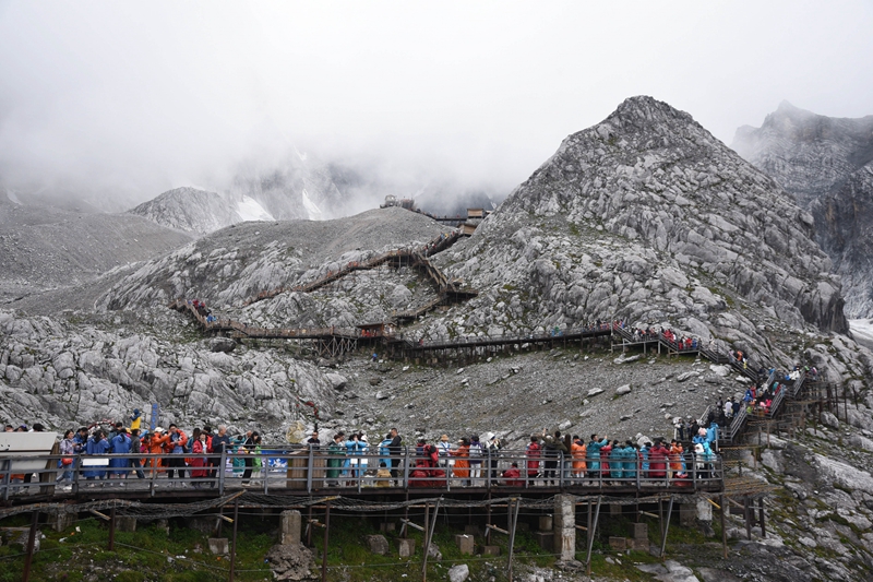 7月28日,游人在云南丽江玉龙雪山观云海。