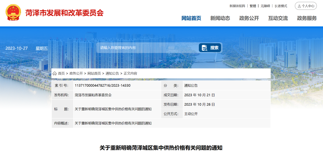 10月26日,菏泽市发改委发布《关于重新明确菏泽城区集中供热价格有关问题的通知》。具体内容如下: