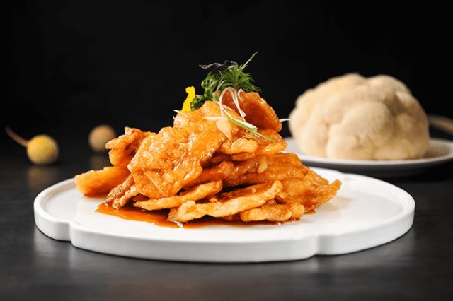 锅包肉,原名锅爆肉,是一道东北菜,光绪年间始创自哈尔滨道台府府尹杜学赢厨师郑兴文之手,后传入沈阳,辽宁人对锅包肉进行了改造,最后一步改用番茄酱或者番茄沙司,外观像极了哈尔滨的“樱桃肉”,减少了锅包肉原有的香酥金黄,成为辽宁沈阳名菜,也是沈阳著名的特色美食之一。锅包肉通常将猪里脊肉切片腌入味,裹上炸浆,下锅炸至金黄色捞起,再下锅拌炒勾芡即成。成菜后,色泽金黄,口味酸甜。锅包肉还被中国烹饪协会评选为“中国菜”之辽宁十大经典名菜。 【 详细>>】